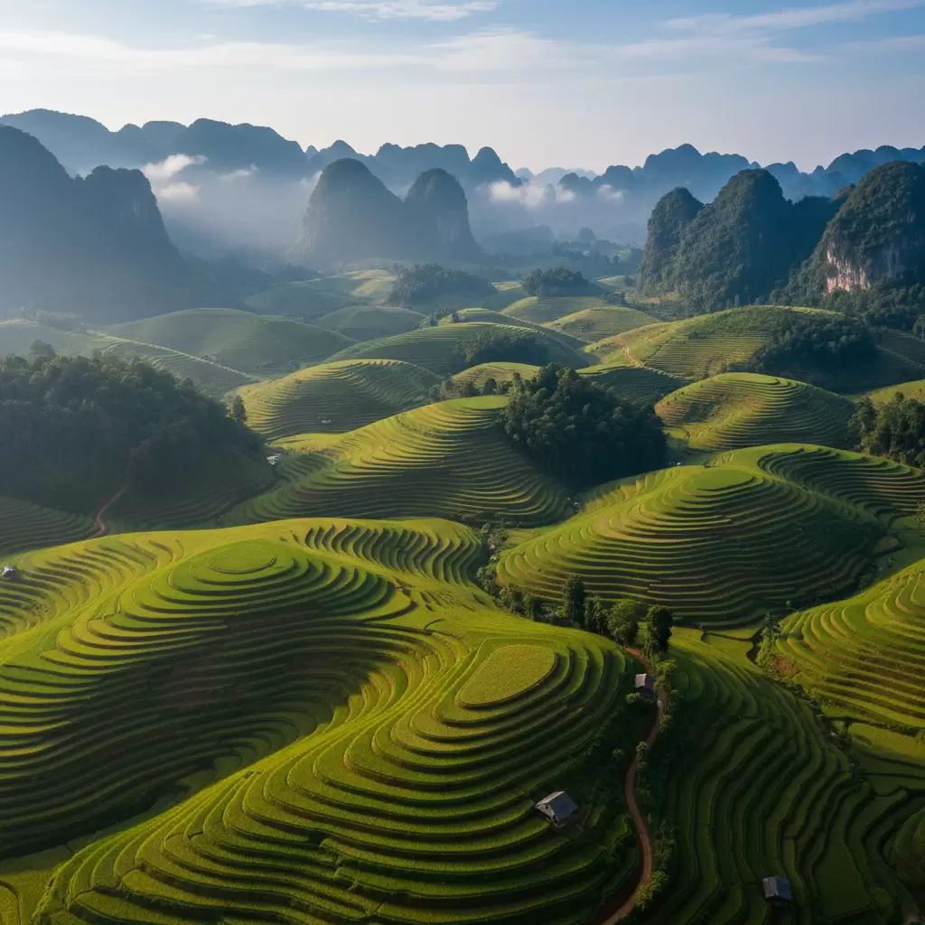 Nhắc đến Pù Luông là nhắc đến những thửa ruộng bậc thang uốn lượn như những dải lụa mềm mại. Bản Báng và Bản Kho Mường là hai khu vực sở hữu tầm nhìn khoáng đạt nhất. Tại đây, bạn có thể bắt trọn khoảnh khắc những lớp sóng lúa xanh mướt vào tháng 5 hoặc sắc vàng óng ả rực rỡ vào tháng 10. Để có một Bộ ảnh “sống ảo” ở Pù Luông: gợi ý các góc chụp không thể bỏ qua, bạn nên chọn những góc máy từ trên cao nhìn xuống để thấy được sự hùng vĩ của địa hình, hoặc đứng giữa những lối mòn nhỏ ven ruộng để tạo cảm giác gần gũi với thiên nhiên.
