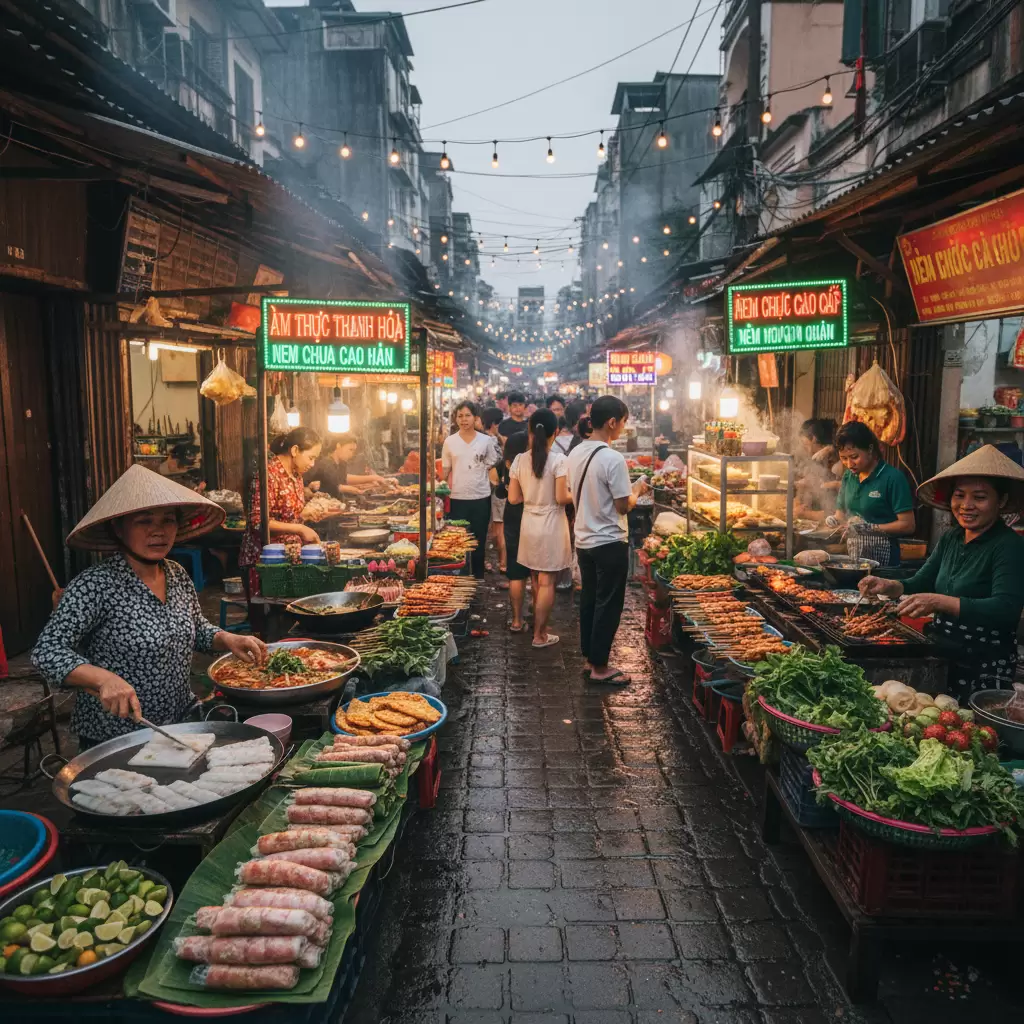 Khi hoàng hôn buông xuống, thành phố Thanh Hóa lại khoác lên mình vẻ nhộn nhịp của những khu phố ẩm thực đường phố. Đây là lúc du khách có thể thong dong dạo bước và khám phá những món ăn vặt độc đáo với mức giá vô cùng phải chăng.